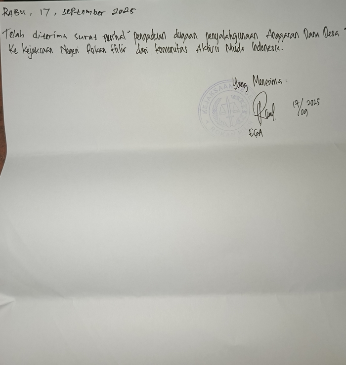 Bagan Siapi-api, Rokan Hilir – Komunitas Aktivis Muda Indonesia (PD KAMI) mengambil langkah tegas dengan melaporkan dugaan penyalahgunaan dana desa dan dana ketahanan pangan di Panipahan, Kabupaten Rokan Hilir. Laporan ini secara resmi diserahkan kepada Kejaksaan Negeri Rokan Hilir pada Rabu, 17 September 2025.