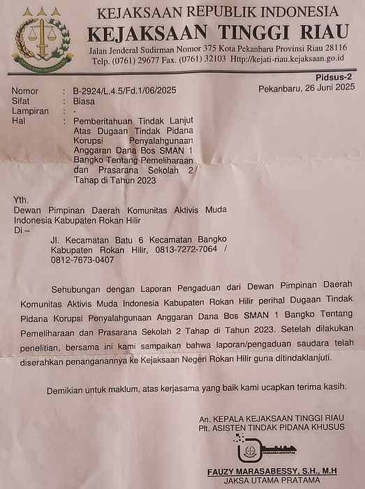 Rokan hilir, — Laporan terkait dugaan penyelewengan dana Bantuan Operasional Sekolah (BOS) SMAN 1 Bangko yang dilaporkan oleh organisasi Komunitas Aktivis Muda Indonesia (PD KAMI) kini ditangani oleh Kejaksaan Negeri (Kejari) Rokan Hilir. Kasus ini merupakan salah satu dari tiga laporan yang dilimpahkan dari Kejaksaan Tinggi (Kejati) Riau pada 26 Juni 2025.