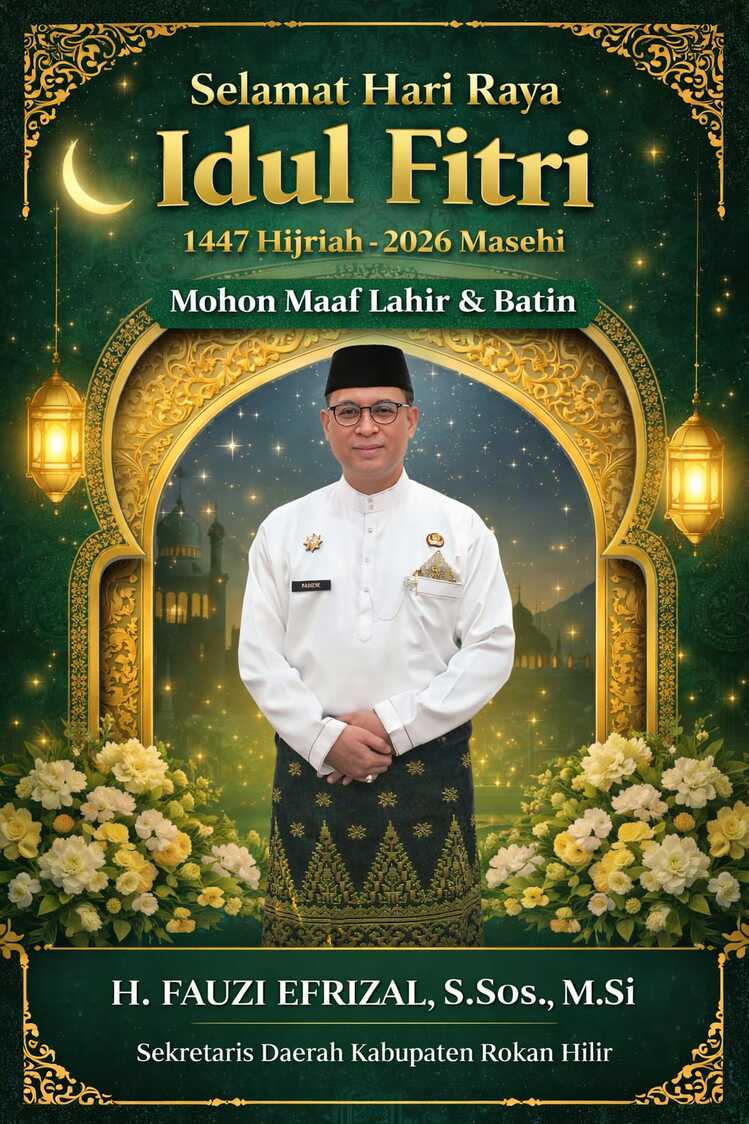 Sekretaris Daerah Kabupaten Rokan Hilir, H. Fauzi Efrizal, S.Sos., M.Si., menyampaikan ucapan selamat Hari Raya Idul Fitri kepada seluruh lapisan masyarakat. Beliau menekankan pentingnya menjaga tali silaturahmi di tengah keberagaman. Selain itu, semangat gotong royong harus terus dipupuk demi kemajuan daerah.